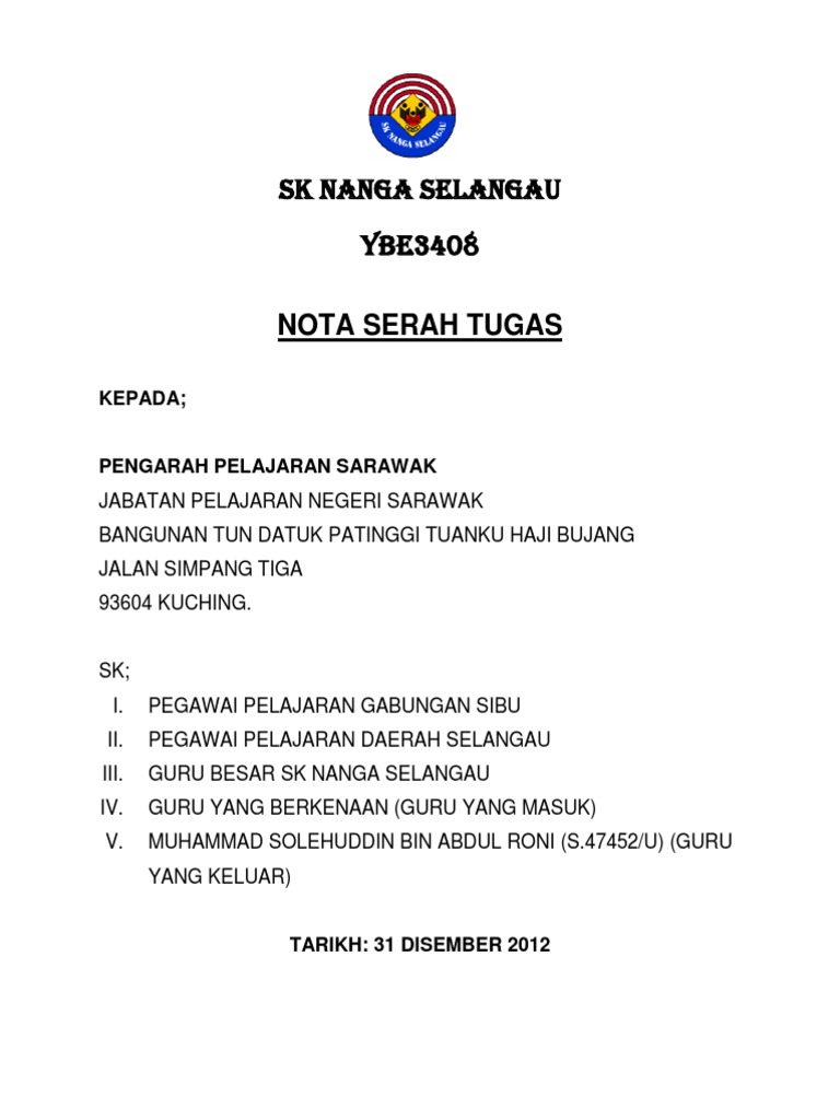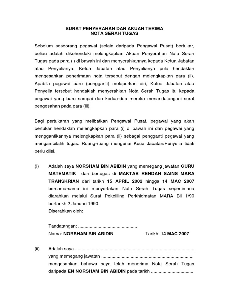 Surat pengantar nikah merupakan salah satu persyaratan yang wajib disertakan kalau kalian ingin mendaftarkan pernikahan ke kantor urusan agama. Nota serah tugas ppm prasekolah n19. Semoga perkongsian cikgu ini allah terima sebagai ibadah dan diganjari pahala. Surat an serahan tugas emi. Termasuk pegawai/kakitangan guna sama yang bertugas di setiap peringkat jakess apabila berlaku pertukaran atau bersara sepertimana diarahkan oleh jabatan perkhidmatan awam melalui surat bil. Surat penyerahan dan akuan terima nota serah tugas i 2. Tentu saja tugas yang diberikan merupakan tugas yang berkaitan dengan tupoksi dari bawahan yang dipilih. Contoh nota serah tugas lengkap have a graphic associated with the other.contoh nota serah tugas lengkap it also will feature a picture of a kind that could be observed in the gallery of contoh. Pekeliling perkhidmatan bil 3 tahun 2004 panduan pertukaran pegawai awam. Surat tugas ini biasanya dibuat oleh seorang atasan atau bagian yang lebih tinggi untuk memberikan tugas kepada bawahan untuk menjalankan suatu tugas tertentu.surat tugas juga merupakan salah satu jenis surat resmi meskipun dalam penggunaanya surat tugas ini bersifat internal (dalam lingkup instansi atau lembaga). Nota serah tugas untuk digunapakai oleh guru yang dapat bertukar. B) adalah saya telah menerima (nama penyelia) nota serah tugas daripada (nama pegawai). Pada zaman modern, ternyata tidak mengurangi eksistensi surat.